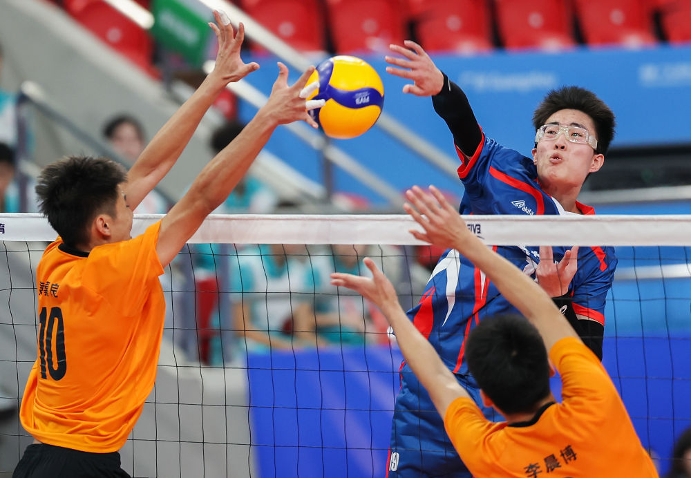 ↑11月14日,黑龙江队球员赵子淳(右)在比赛中扣球。新华社记者 周牧 摄