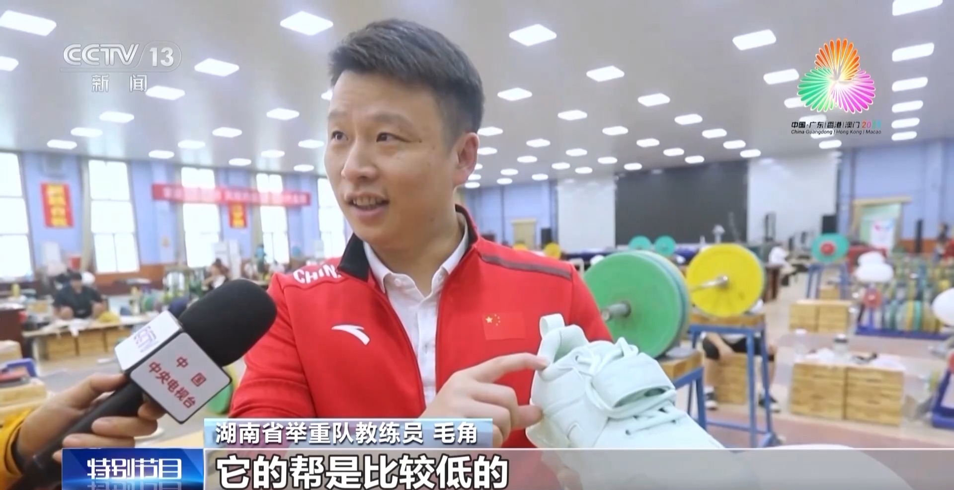 湖南省举重队教练员 毛角:它的帮是比较低的,因为它要保证踝关节的灵活性。